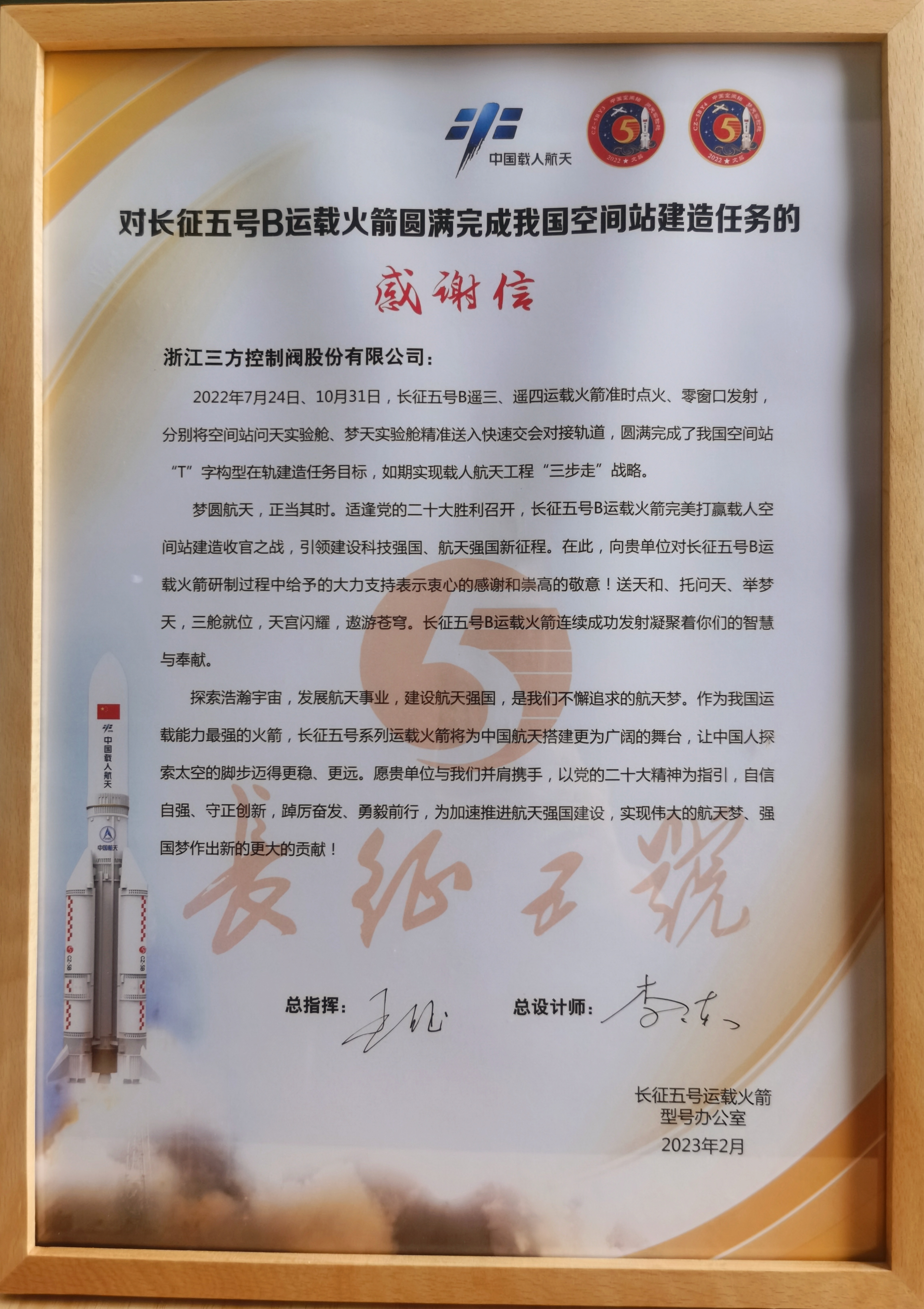 对长征五号B运载火箭圆满完成我国空间站建造任务的感谢信