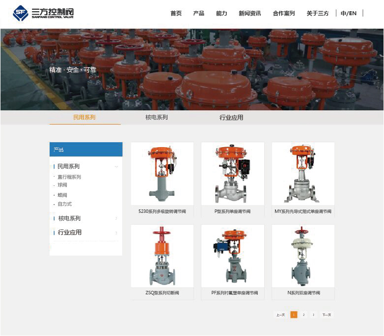 网站顶部菜单栏包括:公司产品、公司实力、AG庄闲集团、合作案例等快捷按钮,使用户一步到位,快速找到所需信息。例如在公司产品页面下,设有民用系列、核电系列和军用系列等三大系列产品分类(二级栏目)。当然用户也可以在本页面的行业应用类别中,查找相关产品。在每个产品的介绍页面,除了详细的文字说明和图片外,用户可以立即下载PDF格式的样本和维护手册,无需注册,大大提高了网站亲和力和效率。