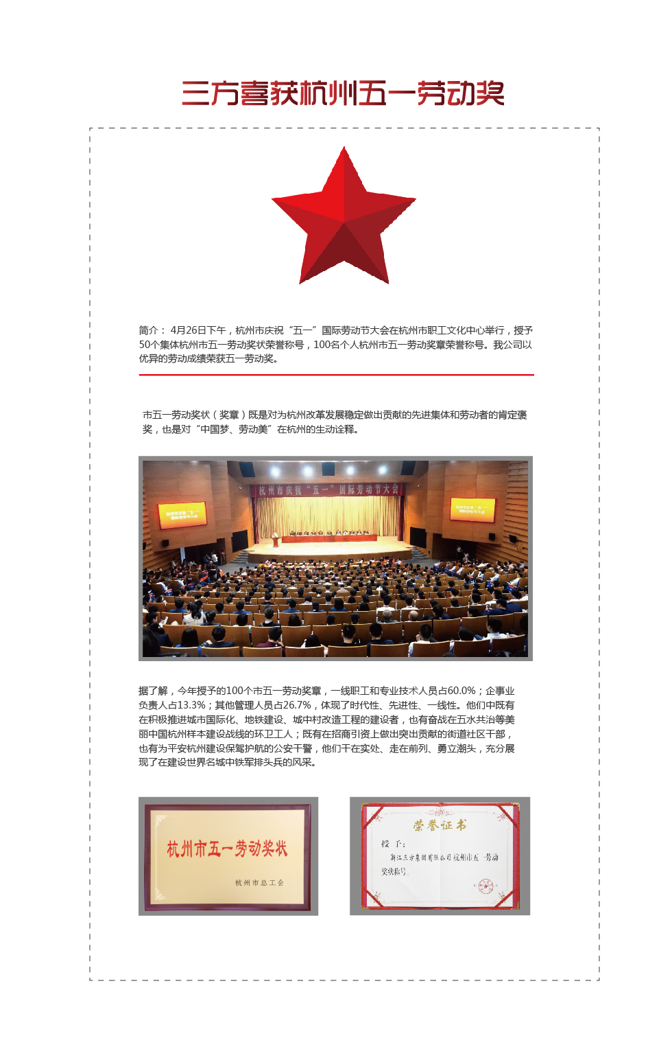 4月26日下午,杭州市庆祝“五一”国际劳动节大会在杭州市职工文化中心举行,授予50个集体杭州市五一劳动奖状荣誉称号,100名个人杭州市五一劳动奖章荣誉称号。我公司以优异的劳动成绩荣获五一劳动奖。